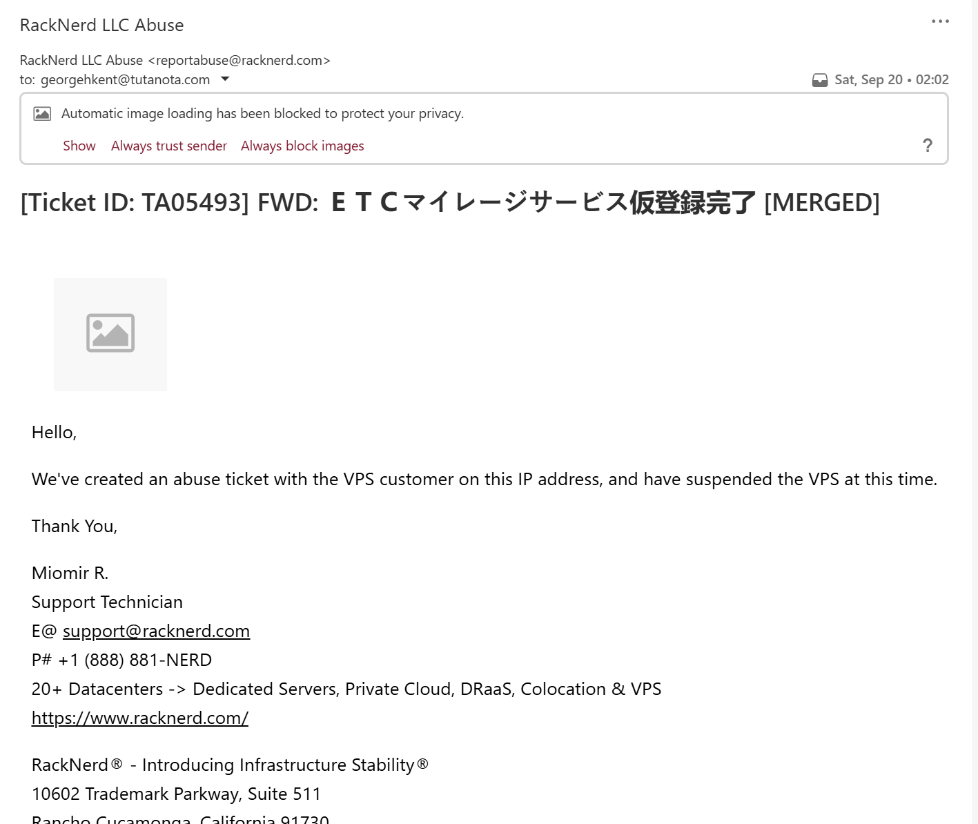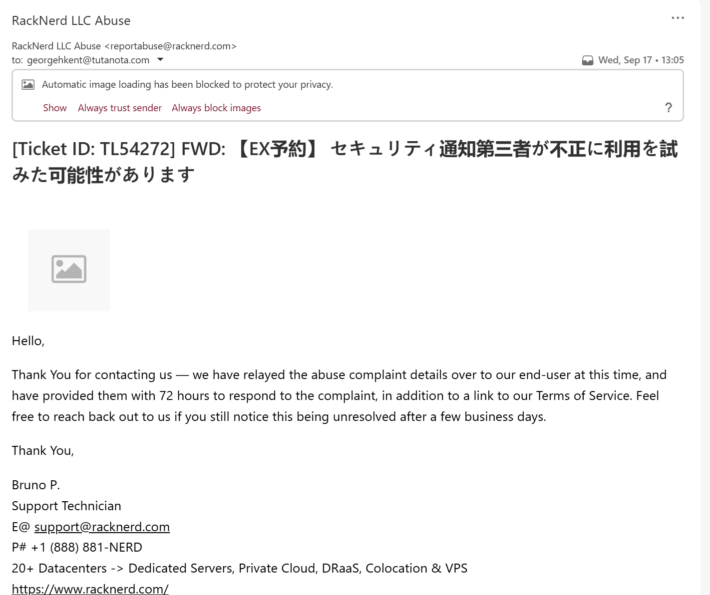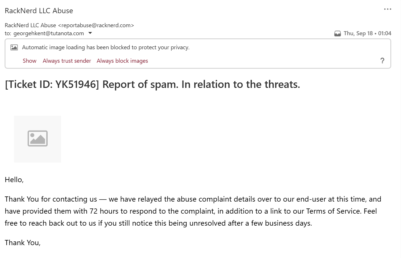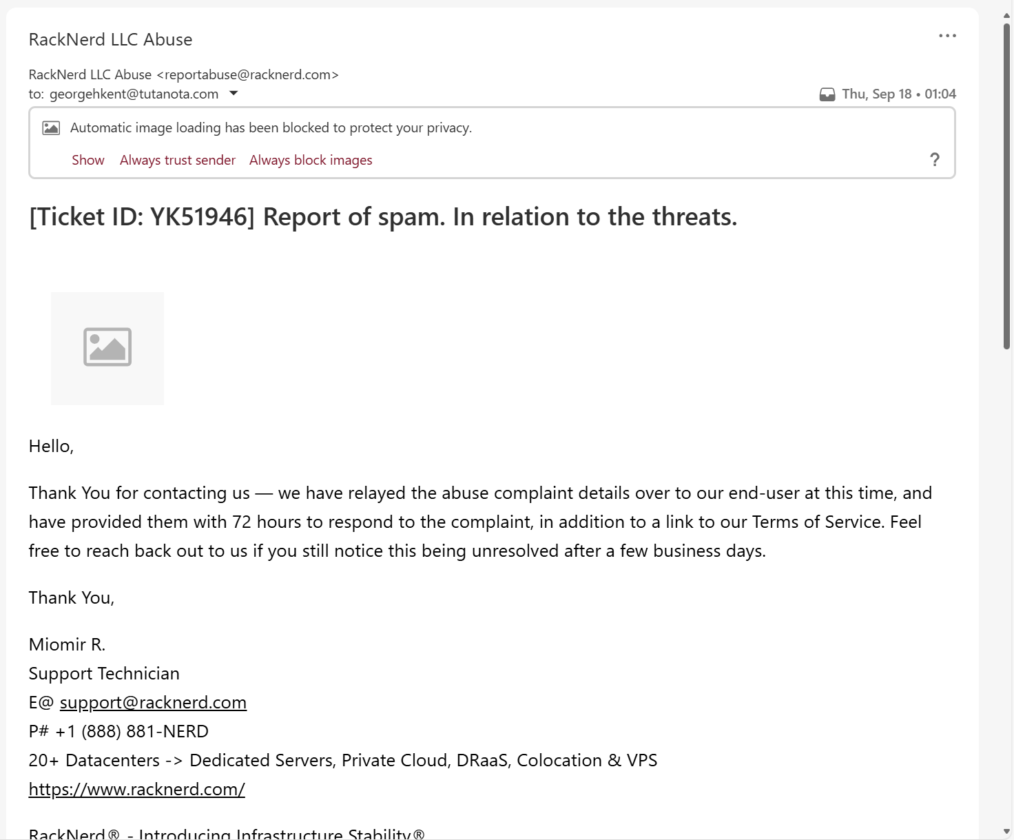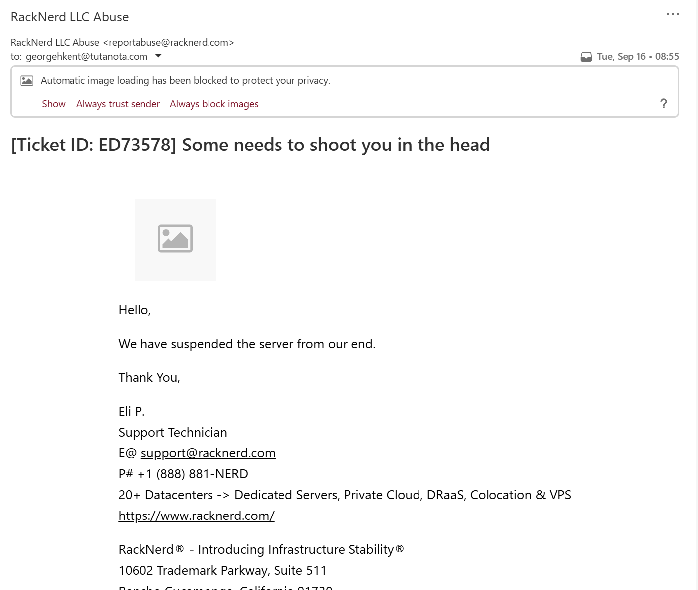The company which is responsible is as you can see racknerd LLC with individuals who work for that company such as Anthony Fye lying on behalf of the US government. They refuse to deal with this issue and one way or another they need to be dealt with and I do not care how that takes place.